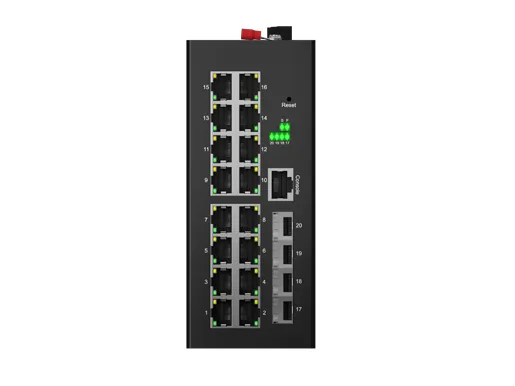 IDSL3LR-04S16G-Z7 is an Industrial Ethernet Managed Switch, with 16x10/100/1000Mbps auto-negotiation RJ45 ports and 4xGigabit SFP interfaces. Leveraging fanless heat dissipation circuit design, wide operating temperature range, and high protection level, it delivers outstanding industrial grade performance, high and low temperature tolerance and lightning protection capabilities. It integrates diverse protocols essential for switching and security functions and supports the public domain Ethernet Ring Protection Switching (ERPS) technology, greatly enhancing network - building flexibility while strengthening the reliability and security of industrial networks. This makes it well suited to meet the deployment demands in applications like rail transit, smart cities, intelligent transportation, outdoor surveillance, and other harsh environments.