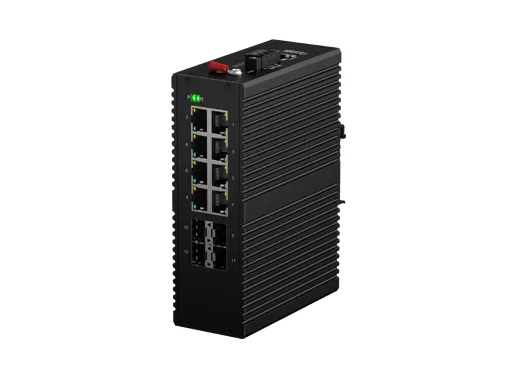 IDSL3R-04X08GP-Z7 industrial Layer 3 managed switch with 8 Gigabit RJ45 and 4 10G SFP+ ports, fanless, -40°C to 75°C, IP40, supports ERPS, delivering high-performance, secure industrial networking for smart cities, rail transit, ITS, and outdoor surveillance.