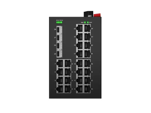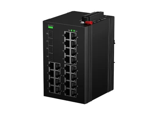 Din-Rail Industrial L2 Managed PoE Switch support 24x 10/100/1000Base-T ports with 30w PoE+ per port (IEEE 802.3at) and 4x10G SFP+ ports, with fan-less cooling circuit design, wide range working temperature -40°C to +75°C, lightning protection, integrated switching, delivers robust networking for mission-critical applications in harsh environments. With rich protocols, ERPS has greatly enhanced the flexibility of the network and enhanced the reliability and security of the industrial network. It can also meet the deployment requirements of rail transit, safe city, intelligent transportation, outdoor monitoring and other applications.